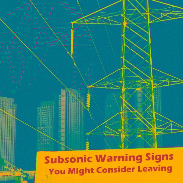 Reader Kyle says "You Might Consider Leaving is a remixed and re-imagined album of Subsonic Warning Signs' breakout album You Might Consider Staying. Both feature the same cover art; Leaving uses a color negative version. Songs on Leaving run the gamut from a Fatboy Slim remix to a demo played on what sounds like an acoustic guitar, toy piano, and an upturned bucket for percussion. Subsonic fans are thrilled to hear the band's normally ultra-slick songs in such different contexts but newcomers to the band are cautioned to start elsewhere."