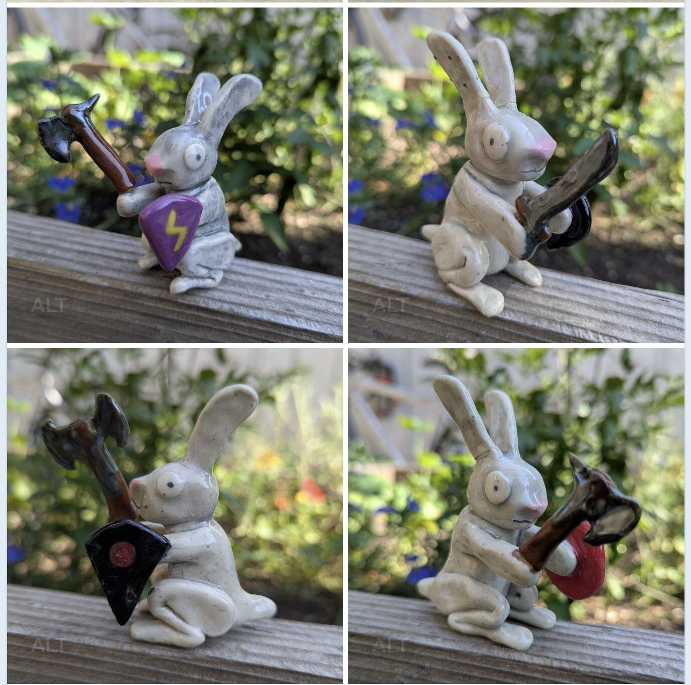 * The ears turned out to be shockingly frangible, and the weapons would sometimes sag or list at unpredictable angles in the glaze fire; I think I've got all those quirks ironed out with more deliberate construction methods and the use of braided nichrome wire as a kind of miniature rebar reinforcement, but the kiln gods can still be capricious.
